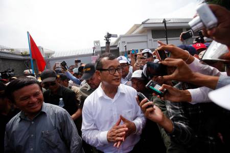 Rainsy, president of the opposition CNRP, speaks to the media after leaving the Chinese Embassy during a protest in central Phnom Penh