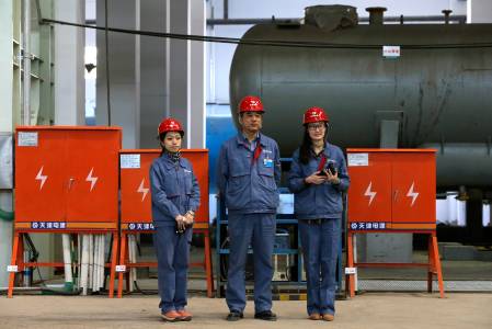 Staff members stand next to gas storage tanks during a government media trip to the construction site of Beijing Jingxi Gas-fired Thermal Power Co Ltd in Beijing