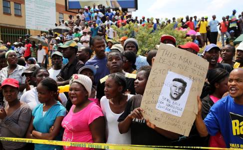 Protesters hold a placard with an identikit image, which according to local media, is a likeliness of a suspect, as they gather outside a local police station during a protest in Diepsloot October 18, 2013. Hundreds of South Africans burned tyres outside a township police station on Friday and demanded the handover for vigilante justice of a fifth suspect arrested for the rape and murder of two toddlers, a crime that has shocked the nation. The mutilated bodies of the two girls aged three and two were discovered in a public toilet in the Johannesburg township of Diepsloot on Tuesday, three days after they were reported missing. REUTERS/Siphiwe Sibeko (SOUTH AFRICA - Tags: POLITICS CIVIL UNREST CRIME LAW)
