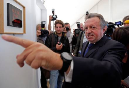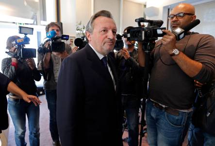 Jean-Noel Guerini (C), Bouches-du-Rhone General Council President, is surrounded by the media during a news conference to speak about his management of the general council in Marseille, October 11, 2013. REUTERS/Jean-Paul Pelissier (FRANCE - Tags: POLITICS MEDIA)