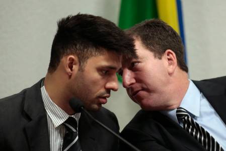 David Miranda (L), partner of Glenn Greenwald, American journalist who first published the documents leaked by former NSA contractor Edward Snowden, looks on as Greenwald testifies in front of the Brazilian Federal Senate's Parliamentary Inquiry Committee, established to investigate allegations of spying by United States on Brazil, in Brasilia October 9, 2013. REUTERS/Ueslei Marcelino (BRAZIL - Tags: POLITICS MEDIA)