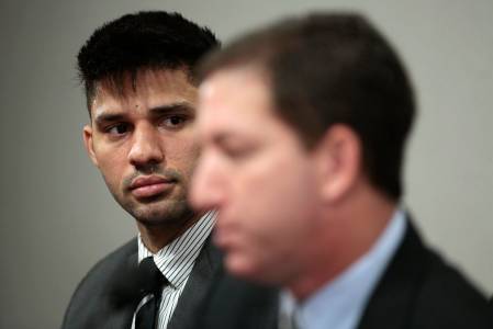 David Miranda, partner of Glenn Greenwald (not seen), American journalist who first published the documents leaked by former NSA contractor Edward Snowden, looks on as Greenwald testifies in front of the Brazilian Federal Senate's Parliamentary Inquiry Committee, established to investigate allegations of spying by United States on Brazil, in Brasilia October 9, 2013. REUTERS/Ueslei Marcelino (BRAZIL - Tags: POLITICS MEDIA)