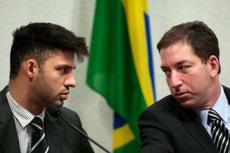 Glenn Greenwald (R), American journalist who first published the documents leaked by former NSA contractor Edward Snowden, looks on while sitting beside partner David Miranda as he testifies in front of the Brazilian Federal Senate's Parliamentary Inquiry Committee, established to investigate allegations of spying by United States on Brazil, in Brasilia October 9, 2013. REUTERS/Ueslei Marcelino (BRAZIL - Tags: POLITICS MEDIA)