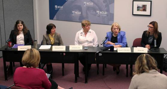 (L-R) Renee Paradis, Chrisse France, Christine Link, Susan O. Sheutzow and Jessie Hill speak to members of the media at a news conference to address three abortion related amendments to the 2013 Ohio budget bill in Cleveland, Ohio October 9, 2013. REUTERS/Aaron Josefczyk (UNITED STATES - Tags: POLITICS BUSINESS HEALTH)