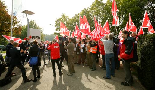 Members of the media take pictures as members of the Swiss UNIA workers union protest in front of the headquarters of soccer's international governing body FIFA in Zurich October 3, 2013. Fifa's executive committee is meeting in Zurich on Thursday and Friday and discussing whether the Qatar 2022 World Cup should be moved from Summer to Winter because of the heat. Qatar has also been hit by criticism of its treatment of migrant workers after a report in the Guardian newspaper said that dozens of migrant Nepalese workers have died in recent weeks. REUTERS/Arnd Wiegmann (SWITZERLAND - Tags: CIVIL UNREST SPORT SOCCER BUSINESS EMPLOYMENT SOCIETY)