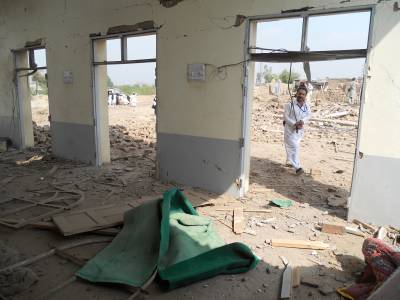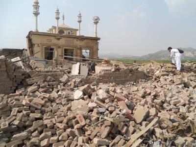 A member of the media walks past a damaged mosque at the site of a bomb attack in the Spin Tal region of Hangu