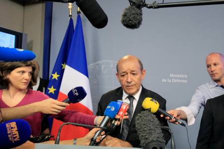France's Defence Minister Jean-Yves Le Drian talks to the journalists after a news conference in Paris