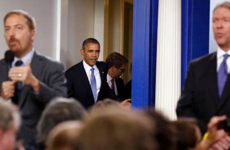 U.S. President Barack Obama walks out before he makes a statement to the media about the government shutdown in the briefing room of the White House in Washington September 30, 2013. Obama said on Monday a government shutdown was entirely preventable and accused Republicans in the House of Representatives of manufacturing a crisis that would hurt the economy and citizens across the country. REUTERS/Larry Downing (UNITED STATES - Tags: POLITICS BUSINESS HEALTH)