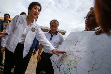 Thailand's Prime Minster Yingluck Shinawatra speaks to the media during a visit to a flood area in Pathum Thani