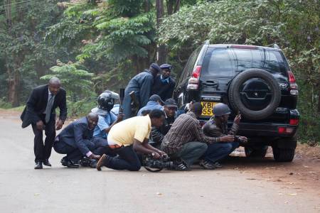 Police officers and members of the media take cover at a distance from the Westgate Shopping Centre after continuous gunfire was heard coming from the mall in Nairobi September 23, 2013. Thick smoke poured from the besieged Nairobi mall where Kenyan officials said their forces were closing in on Islamists holding hostages on Monday, three days after a raid by Somalia's al Shabaab killed at least 62 people. It remained unclear how many gunmen and hostages were still cornered in the Westgate shopping centre, two hours after a series of loud explosions and gunfire were followed by a plume of black smoke, that grew in volume from one part of the complex. REUTERS/Siegfried Modola (KENYA - Tags: CIVIL UNREST POLITICS)