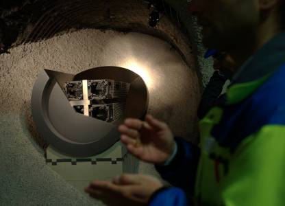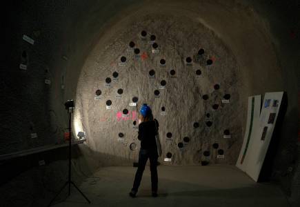 A journalist takes a pictures of holes at an experiment in the Mont Terri rock laboratory in St-Ursanne