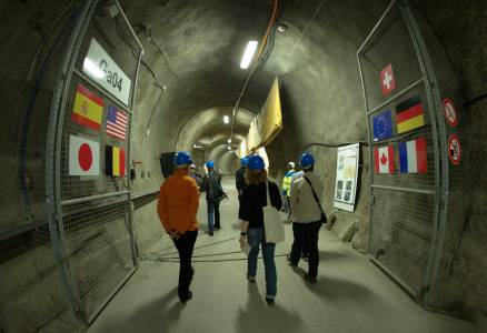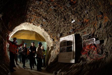 Journalists enter the Mont Terri rock laboratory, a research project of the Swiss Federal Office of Topography (Swisstopo), in St-Ursanne, western Switzerland, September 19, 2013. The Mont Terri Project is an international research project on the hydrogeological, geochemical and geotechnical characterisation of a clay formation (Opalinus Clay). Clay formations are being considered in various countries for the deep geological disposal of radioactive waste and is the only host rock being proposed in Switzerland. The rock laboratory is dedicated solely to research, as such no radioactive waste is disposed here. REUTERS/Denis Balibouse (SWITZERLAND - Tags: ENVIRONMENT ENERGY SCIENCE TECHNOLOGY)