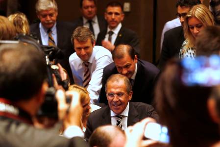 Russian Foreign Minister Sergei Lavrov (C) smiles as he is surrounded by the media, following meetings regarding Syria with U.S. Secretary of State John Kerry, at a news conference in Geneva September 14, 2013. The United States and Russia have agreed on a proposal to eliminate Syria's chemical weapons arsenal, Kerry said on Saturday after nearly three days of talks with Lavrov. REUTERS/Larry Downing (SWITZERLAND - Tags: POLITICS CIVIL UNREST MEDIA TPX IMAGES OF THE DAY)