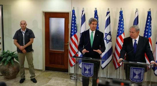 An Israeli security member stands guard as U.S. Secretary of State John Kerry (C) speaks to the media next to Israel's Prime Minister Benjamin Netanyahu (R) at the prime minister's office in Jerusalem September 15, 2013. Kerry briefed Netanyahu on Sunday on a U.S.-Russian deal to remove Syria's chemical weapons, an accord that drew a guarded response from the Israeli leader. REUTERS/Larry Downing (JERUSALEM - Tags: POLITICS CIVIL UNREST)