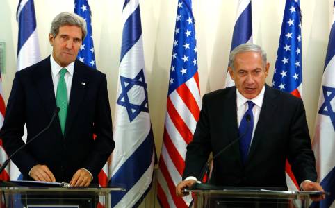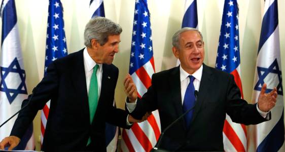 U.S. Secretary of State Kerry leans towards Israel's Prime Minister Netanyahu while speaking to the media at the prime minister's office in Jerusalem