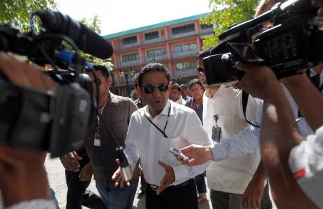 Maldivian presidential candidate Abdulla Yameen specks to the media after casting his vote during the presidential elections in Male September 7, 2013. Voters in the Maldives go to the polls on Saturday to elect a president after nearly 20 months of intermittent protests and sporadic violence triggered when the previous government was ousted. REUTERS/Dinuka Liyanawatte (MALDIVES - Tags: POLITICS ELECTIONS MEDIA)