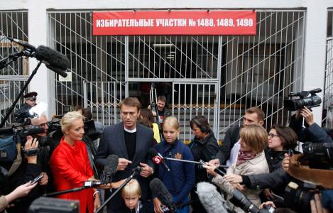 Opposition leader Navalny and family talks to the media outside a polling station in Moscow