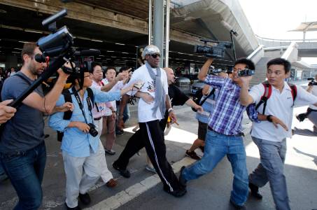 Former basketball star Dennis Rodman is followed by journalists chasing him upon his arrival at Beijing Capital International Airport