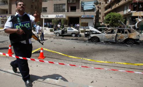A policeman asks members of the media and onlookers to move back at the site of an explosion near the house of Egypt's interior minister at Cairo's Nasr City district
