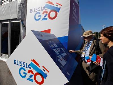 Journalists stand near an information stand by the main press centre of the G20 summit in Strelna near St. Petersburg September 4, 2013. The Group of 20 cut its teeth in the global financial crisis of 2009, achieving unprecedented cooperation between developed and emerging nations to stave off economic collapse which has not been matched since. REUTERS/Alexander Demianchuk (RUSSIA - Tags: MEDIA BUSINESS POLITICS)