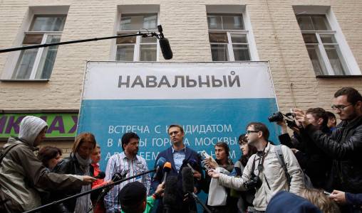 Russia's opposition leader and anti-graft blogger Alexei Navalny talks to the media outside his campaign headquarters in Moscow