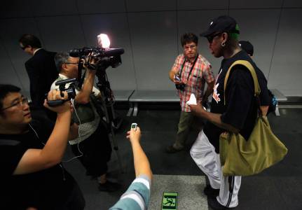 Former basketball star Dennis Rodman talks to media as he transits to Pyongyang from Beijing Capital International Airport, September 3, 2013. Flamboyant former basketball star Rodman will arrive in Pyongyang on Tuesday for a five-day visit to North Korea, his second this year, but said he had no plans to negotiate the release of a jailed American missionary. REUTERS/Petar Kujundzic (CHINA - Tags: POLITICS SPORT BASKETBALL MEDIA)