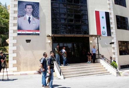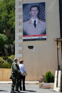 Journalists and security personnel stand in front of Yousef al-Azma military hospital during a visit by team of United Nations chemical weapons experts in Damascus August 30, 2013. United Nations inspectors arrived at a military hospital in a government-held area of Damascus on Friday to visit soldiers affected by an apparent chemical attack, a Reuters witness said. The inspectors have spent the week visiting rebel-controlled areas on the outskirts of Damascus after reports of a poison gas attack last week that the opposition blames on President Bashar al-Assad. The Syrian government accuses the rebels of firing chemical munitions at civilians and soldiers.The photo on the wall of Syrian President Bashar al-Assad. REUTERS/Khaled al-Hariri (SYRIA - Tags: POLITICS CONFLICT CIVIL UNREST HEALTH MEDIA)
