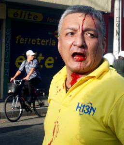 Colombian journalist Oscar Montoya is seen after being wounded by riot police during a protest against the government of Colombian President Juan Manuel Santos in Medellin August 29, 2013. Santos, who has been unable to end the so-called national strike that has united potato growers, milk producers, teachers and health workers, acknowledged agriculture is in crisis, but called for peaceful dissent while talks about possible solutions are going on. REUTERS / Albeiro Lopera (COLOMBIA - Tags: MEDIA CIVIL UNREST POLITICS)