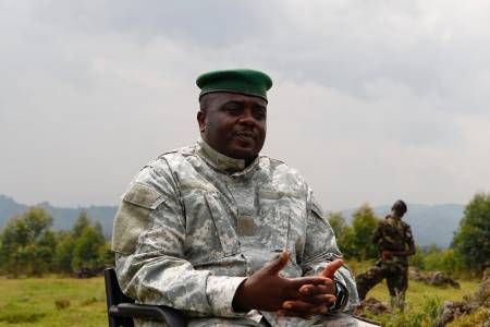 Congolese M23 rebel leader Bisimwa Bertrand speaks to the media in Bunagana in this August 2, 2013 file photo. To match Insight CONGO-UN/ REUTERS/James Akena/Files (DEMOCRATIC REPUBLIC OF CONGO - Tags: POLITICS CIVIL UNREST MILITARY)