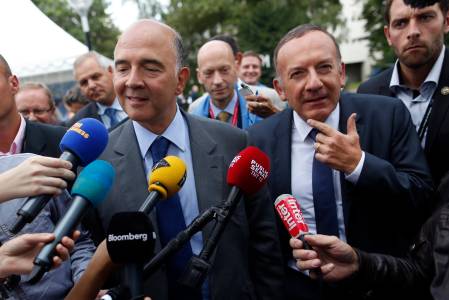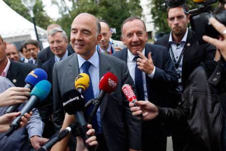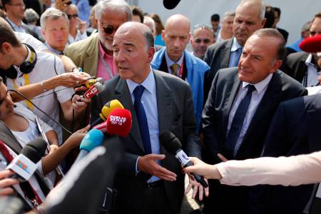 French Finance Minister Pierre Moscovici speaks to the media as he leaves the MEDEF summer forum in Jouy-en-Josas