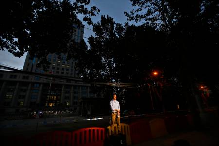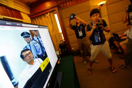 A journalist stands on cases, in front of the Jinan Intermediate People's Court, at the end of the third day of ousted Chinese senior politician Bo Xilai's trial in Jinan, Shandong province August 24, 2013. Bo admitted to shaming his country and poorly handling a defection attempt by his former police chief after he told Bo that Bo's wife had committed murder, but Bo denied trying to protect her from the accusation. Bo, once a rising star in China's leadership, is facing charges of corruption, bribery and abuse of power. REUTERS/Carlos Barria (CHINA - Tags: POLITICS CRIME LAW MEDIA)
