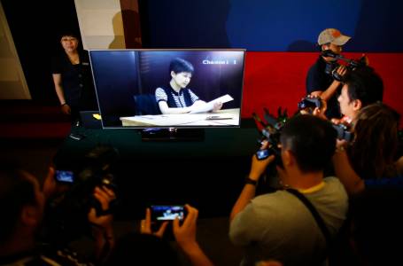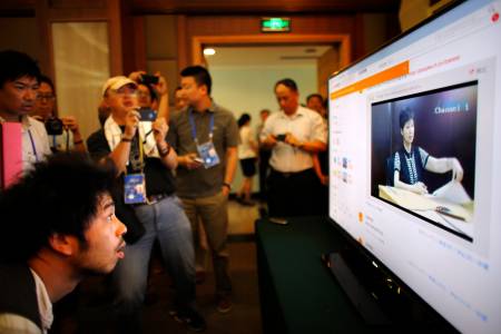 Journalists watch and take pictures of a screen displaying a court's microblog page showing a video of Gu Kailai, wife of ousted Chinese Communist Party Politburo member Bo Xilai at a media room near the court where Bo's trial is being held in Jinan, Shandong province August 23, 2013. Fallen politician Bo Xilai put up a feisty defence on Thursday as he faced China's most political trial in decades, saying he was framed in bribery charges against him and had admitted to them under psychological pressure during interrogation. REUTERS/Carlos Barria (CHINA - Tags: POLITICS MEDIA CRIME LAW)