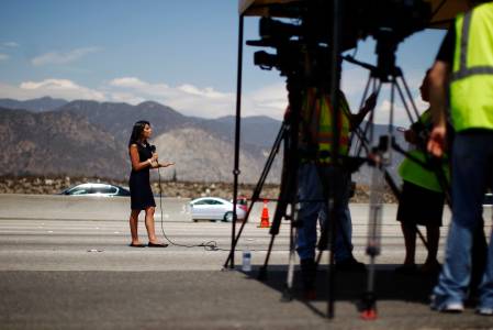 Television journalists report on the 210 freeway near the wreckage of a tour bus that was ferrying passengers to a California casino when it overturned in Irwindale