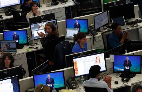 Journalists applaud in the newsroom as Al Jazeera America begins broadcasting in New York