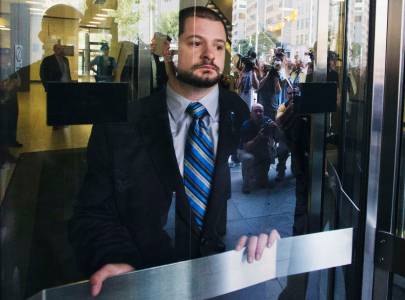 Toronto police officer Constable James Forcillo leaves the court as members of the media are reflected in the window after being let out on bail in Toronto, August 20, 2013. Forcillo surrendered himself on Tuesday to the Special Investigations Unit, a civilian agency that acts as a police watchdog, after being charged with second-degree murder in the shooting death of 18- year-old Sammy Yatim, during an altercation on a streetcar used for public transit in July, according to local reports. REUTERS/Mark Blinch (CANADA - Tags: CRIME LAW MEDIA TPX IMAGES OF THE DAY)