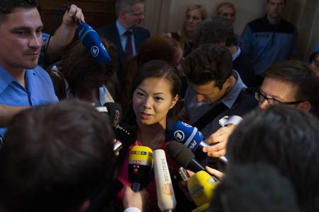 Tina K. (C), joint plaintiff and sister of German-Vietnamese victim Jonny K., speaks to journalists outside the courtroom after the announcement of the verdicts in Berlin, August 15, 2013. Verdicts are expected on Thursday for six men accused of having beaten to death German-Vietnamese man Jonny K. in what appeared to be an unprovoked attack at Berlin's Alexanderplatz late night on October 14, 2012. REUTERS/Thomas Peter (GERMANY - Tags: CRIME LAW MEDIA)