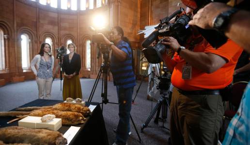 Two stuffed specimens of the newly-discovered mammal, "Olinguito (Bassaricyon neblina)," are pictured by the media at the Smithsonian in Washington