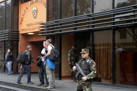 Policemen stand guard as journalists wait for news outside the headquarters of the anti-drug unit of the National Police of Peru in Lima
