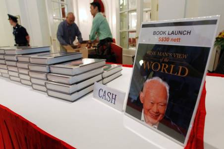 Copies of Singapore's former Prime Minister Lee's latest book entitled One Man's View of the World are displayed for sale at his book launch at the Istana in Singapore