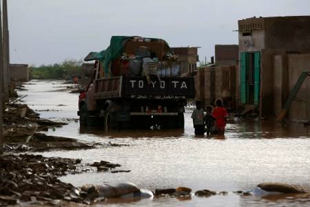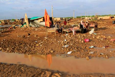 Family members rest in the remains of their house destroyed by floods caused by heavy rains in Khartoum