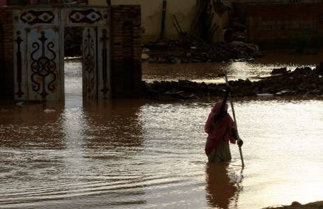 A woman, whose house was destroyed by floods caused by heavy rains, wades through the floodwaters with a stick in Khartoum