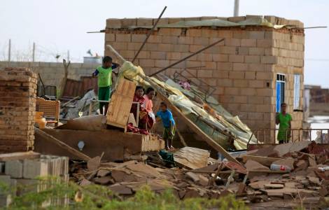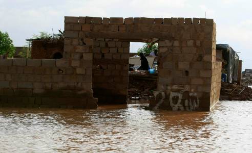Family members rest in the remains of their house destroyed by floods caused by heavy rains in Khartoum