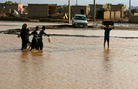 Children walk through the floodwaters carrying items salvaged from their houses destroyed by the floods caused by heavy rains in Khartoum