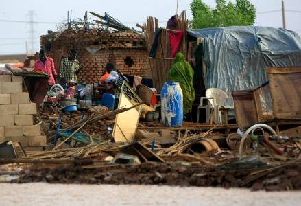 People rest in the remains of their house destroyed by floods caused by heavy rains in Khartoum