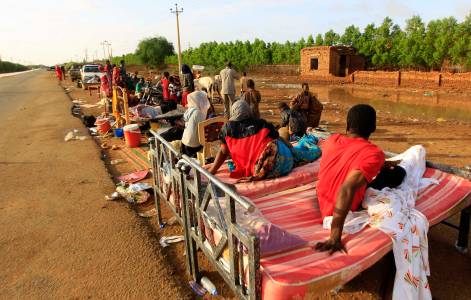 People, who are homeless after floods caused by heavy rains destroyed their homes, rest along a road in Khartoum