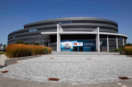 Sky Deutschland headquarters, one of the largest pay-TV operators in Germany and Austria is pictured in Unterfoehring near Munich August 4, 2013. German pay-TV operator Sky Deutschland gained more subscribers than expected during the second quarter, helped by German soccer triumphs. Sky Deutschland added 47,900 customers to 3.45 million during the quarter, beating even the most optimistic expectation of 44,000 in a Reuters poll. The company, which is majority owned by Rupert Murdoch's News Corp, said earnings before interest, tax, depreciation and amortisation (EBITDA) rose 60 percent to 36.8 million euros ($48.7 million). Picture taken August 4, 2013. REUTERS/Michaela Rehle (GERMANY - Tags: SPORT BUSINESS MEDIA LOGO)
