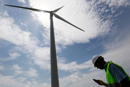 A worker stands next to a wind turbine, the first of 88 installed at the Wind Power Park Eolico, in Penonome