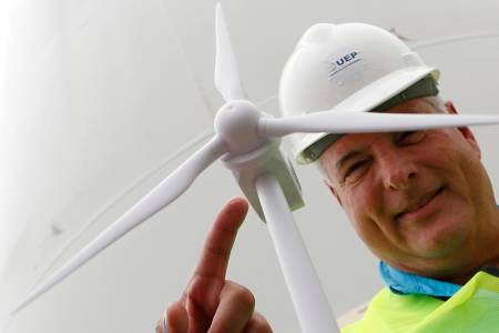 A worker stands next to a wind turbine, the first of 88 installed at the Wind Power Park Eolico, during a presentation to the media in Penonome August 5, 2013. According to Union Eolica Panamena's General Director Rafael Perez, the wind farm will complete all 88 wind turbines by the end of the year, producing 220 Mega Watts of energy, making it the biggest in Central America. REUTERS/Carlos Jasso (PANAMA - Tags: ENERGY ENVIRONMENT SOCIETY)