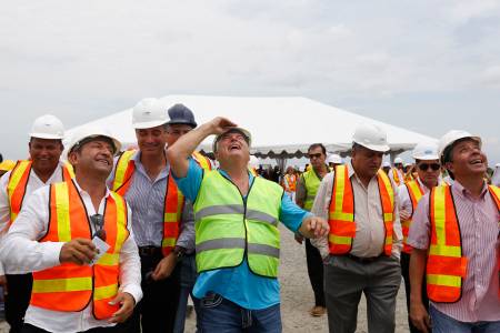 Panama's President Ricardo Martinelli (C) looks up at a wind turbine (not pictured), the first of 88 installed at the Wind Power Park Eolico, during a presentation to the media in Penonome August 5, 2013. According to Union Eolica Panamena's General Director Rafael Perez, the wind farm will complete all 88 wind turbines by the end of the year, producing 220 Mega Watts of energy, making it the biggest in Central America. REUTERS/ Carlos Jasso (PANAMA - Tags: POLITICS ENERGY ENVIRONMENT SOCIETY)