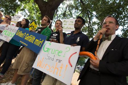 Members of the Green Party, Die Gruenen, dressed in green T-shirts, eat ice cream as they watch a protest of members of the youth wing of the liberal Free Democratic Party (FDP), who have a barbecue in front of the Green Party headquarters denouncing a proposed vegetarian day in Berlin August 5, 2013. Germany's Green Party said it would push for the introduction of a vegetarian day in publicly run canteens to reduce the amount of meat consumption in Germany, local media reported. The placards reads: "I like barbecue," "Hands off my wurst." REUTERS/Thomas Peter (GERMANY - Tags: CIVIL UNREST POLITICS)
